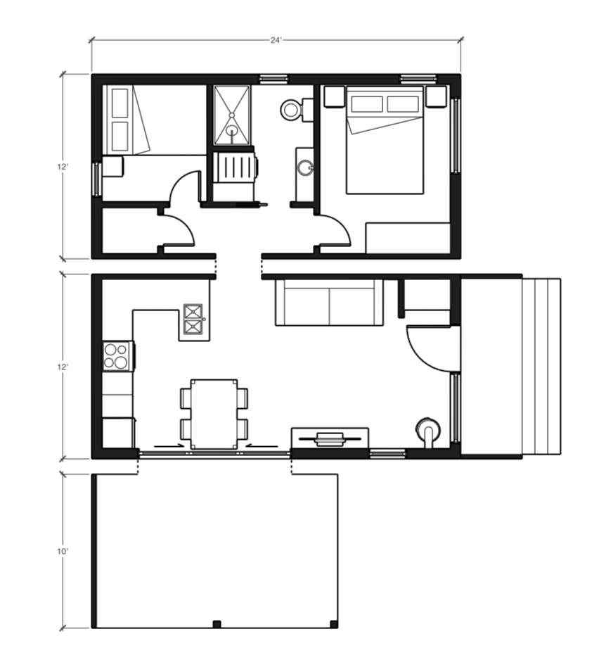 Pensé pour les petites familles ou les escapades entre amis, ce modèle offre deux chambres fermées, une salle de bain complète, ainsi qu’un espace cuisine-salon décloisonné, ouvert sur l’extérieur grâce à une grande fenestration et une terrasse intégrée.